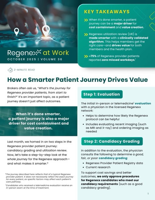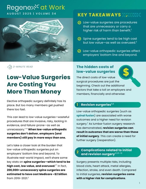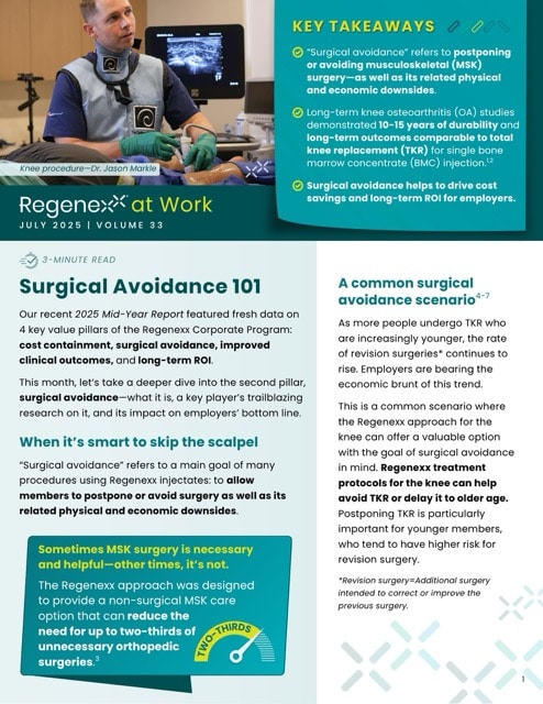 Ready to supercharge your benefits plan? Our Regenexx At Work newsletter is your essential guide. Monthly insights demystify interventional orthobiologics and show you how the Regenexx Corporate Program helps employers create lasting value by reducing healthcare costs and improving employee well-being and productivity. Subscribe to receive our monthly newsletter in your inbox.